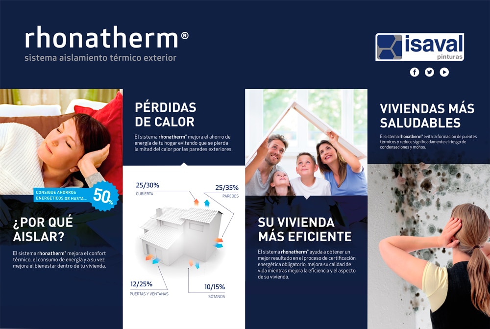 Within the complete offer of solutions in windows, ceilings, solar protection, interiors, lighting, home automation, air conditioning, refrigeration systems, refurbishment companies, financing, swimming pools, security, etc. of the fair, Pinturas Isaval is attending the event to present rhonatherm, the company’s ETICS system.