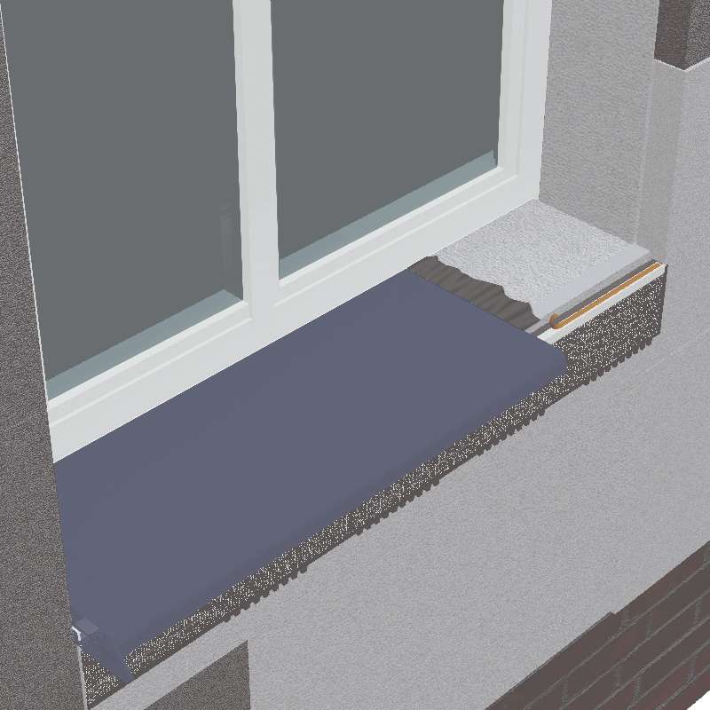 - Posicionar y embeber la malla del trozo de tira de Perfil Alféizar, previamente cortado a la medida exacta del hueco, sobre el todavía Rhona T-700 fresco. También se tiene que quedar adherido la parte de pvc del perfil, éste en la posición horizontal. Dejar secar el mortero adhesivo un mínimo de 24h.